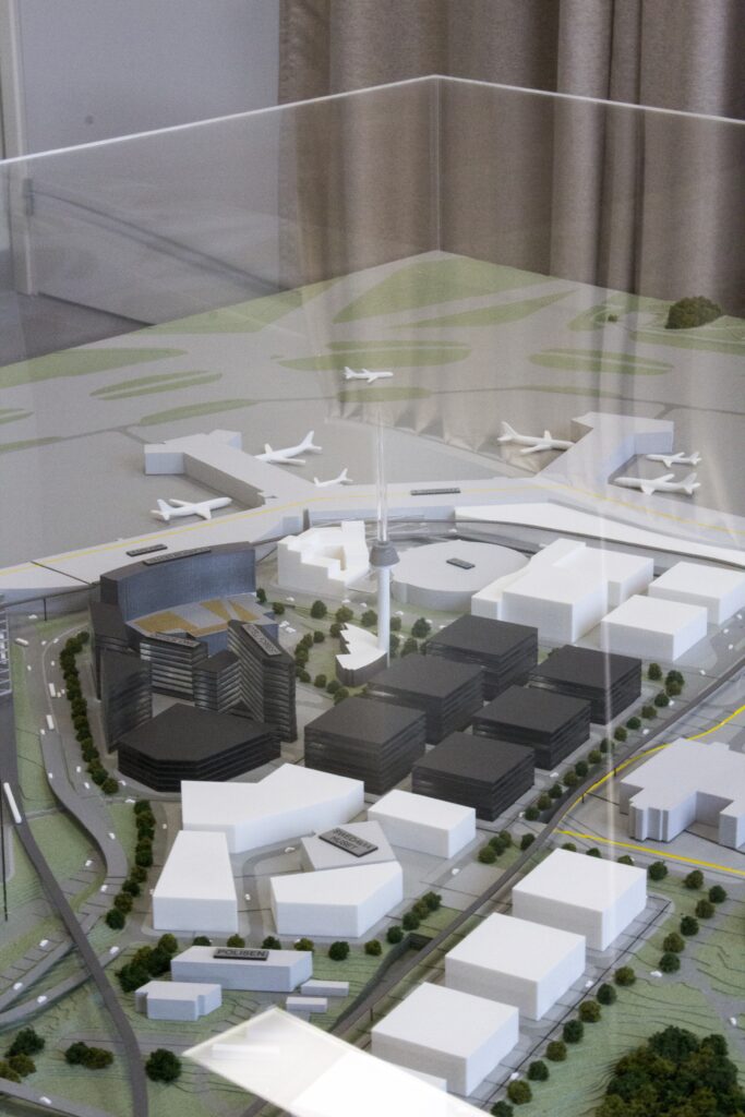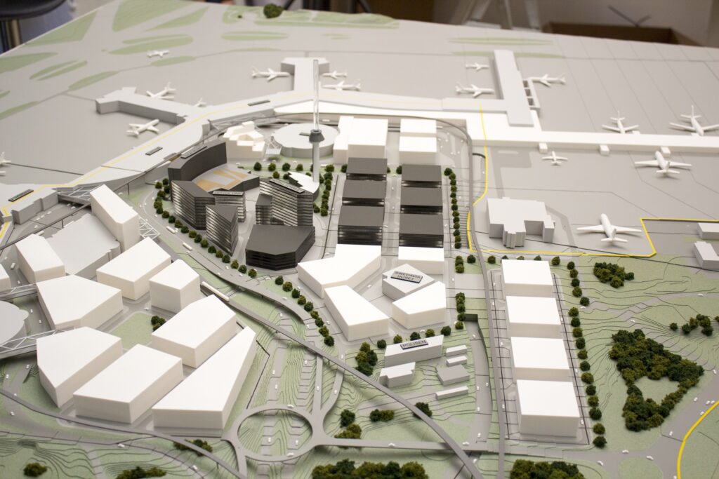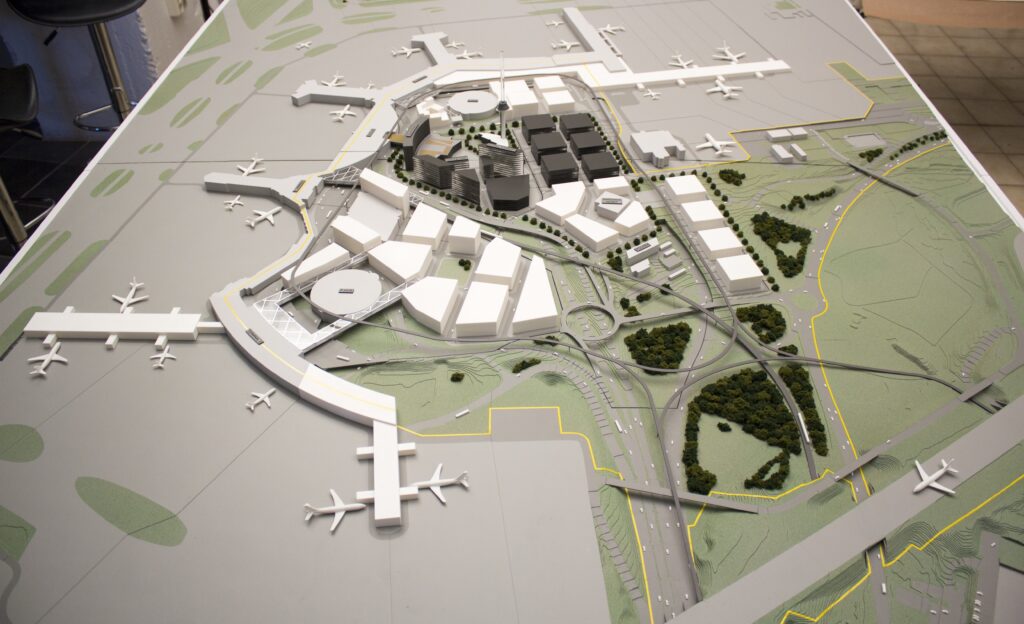 Översiktsmodell över tillbyggnader på Arlanda flygplats.