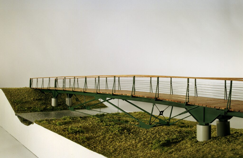 Gångbro på Årstafältet, Stockholm. Modellen är tillverkad i plast, trä och metall.Skala 1:50Leif Bolter