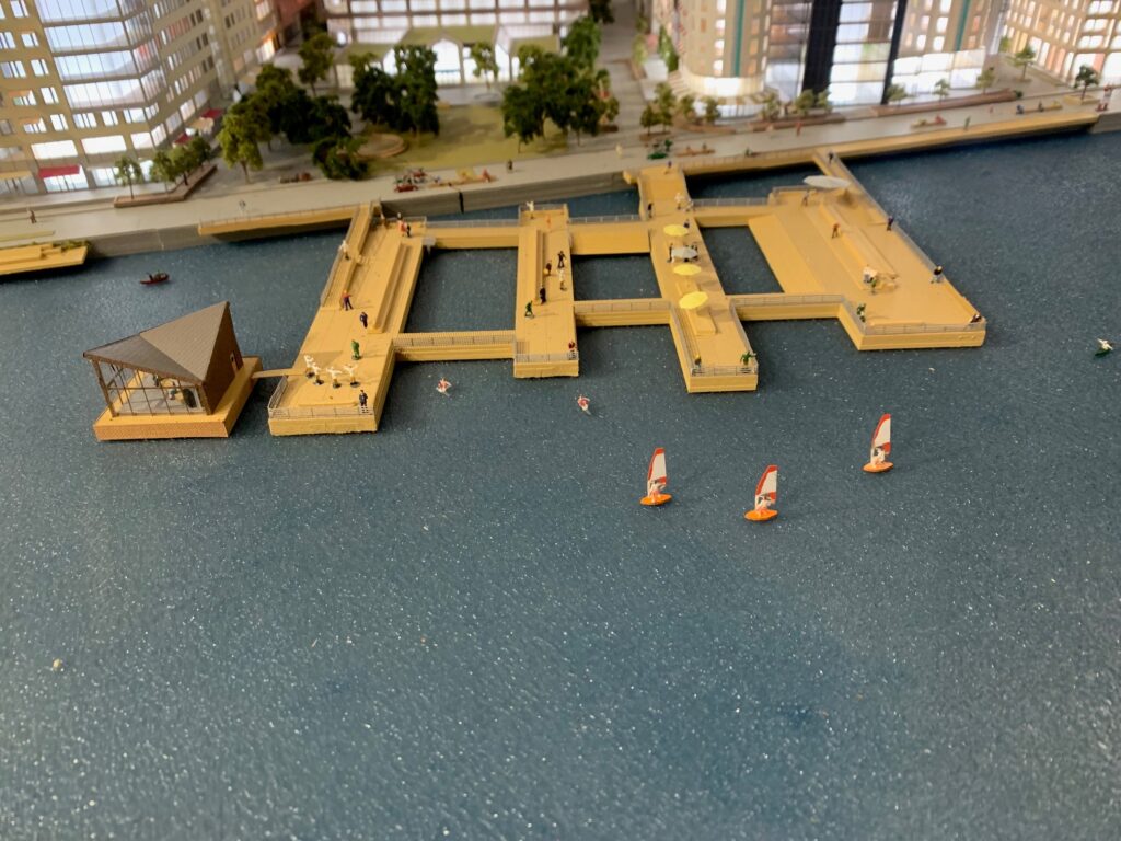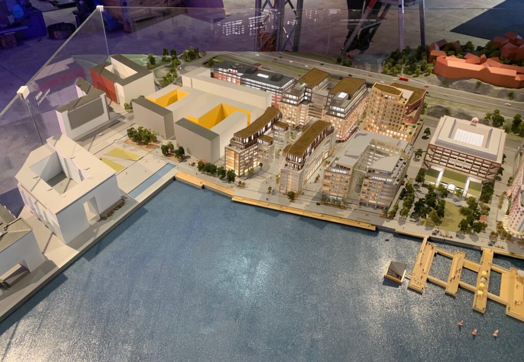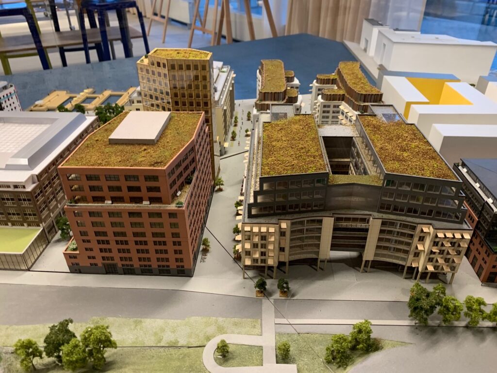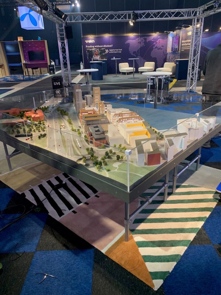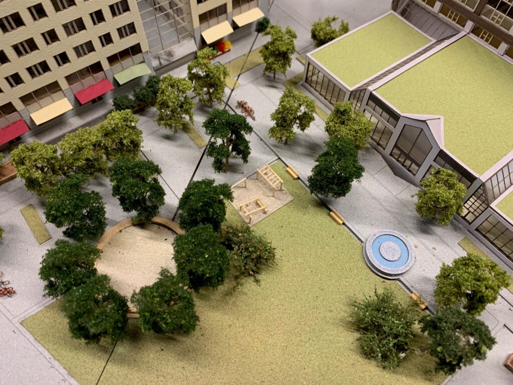 Försäljningsmodell med belysning i de individuella husen som styrs via en knappanel.Skala 1:200AMF Fastigheter