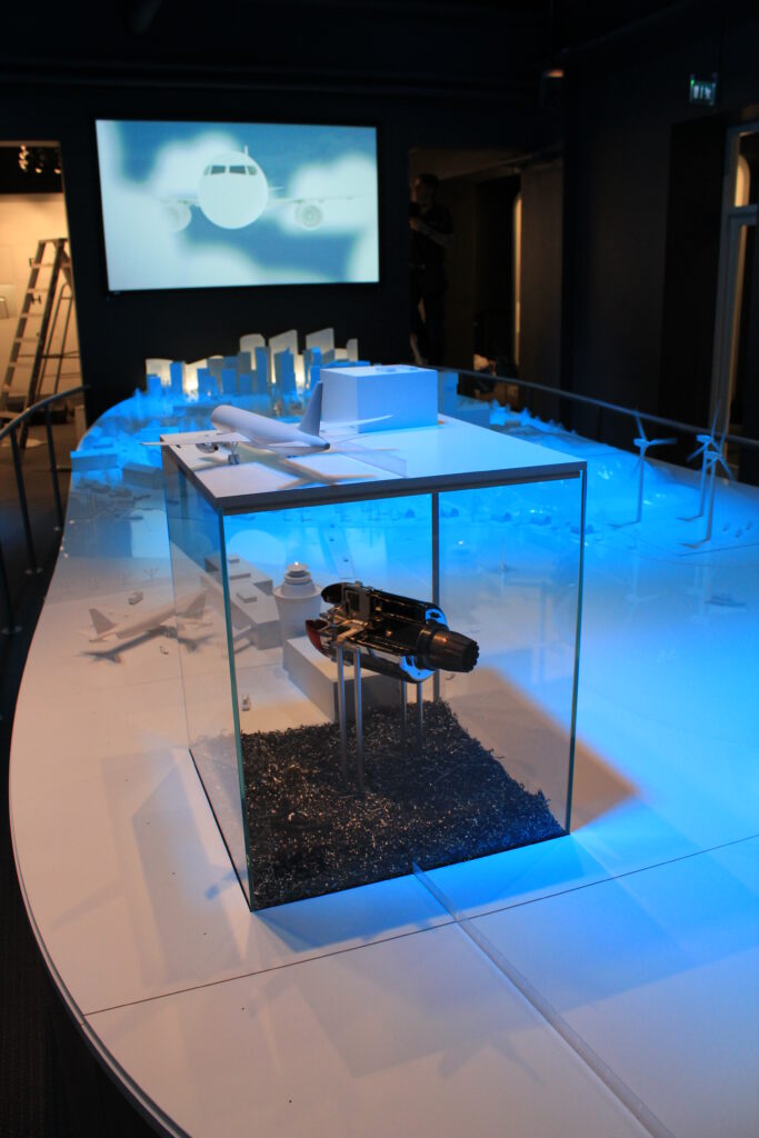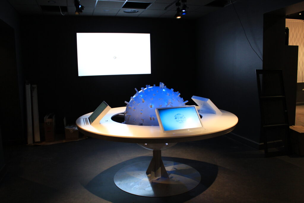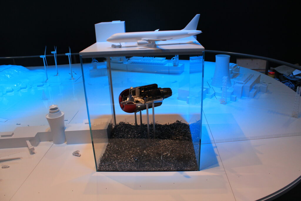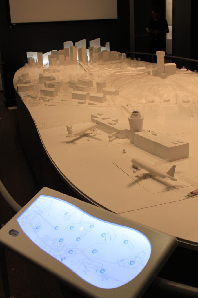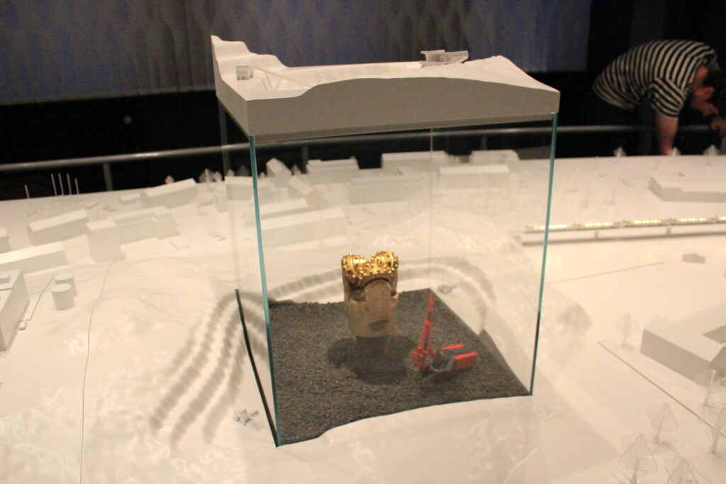 En interaktiv modell med kontrollpanel som styr glaslådor som höjs upp ur bottenplattan. Lådorna visar mer ingående vilka områden Sandvik jobbar inom. Modellen är 20 kvm.Sandvik